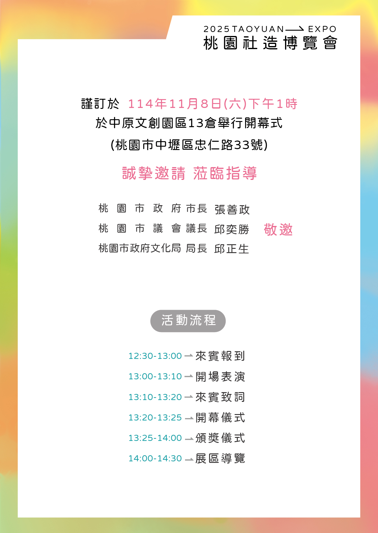 (一) 開幕式:114年11月8日(星期六)下午1時,活動地點為中原文創園區13倉。