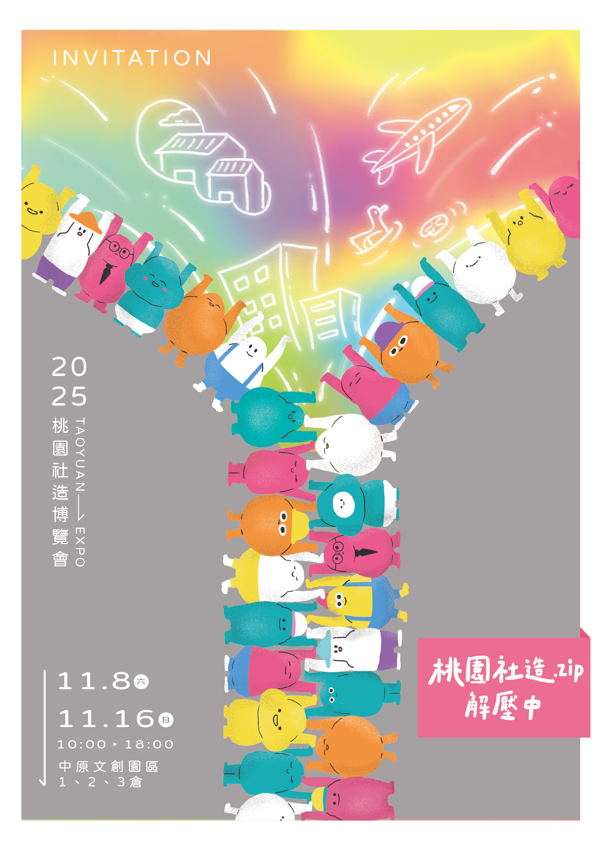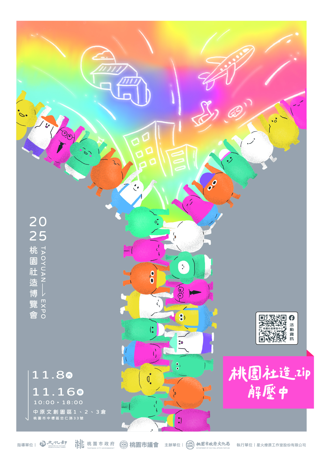 一、 為呈現桃園市推動社區總體營造成果,邀請各單位夥伴一同體驗桃園社造「解壓縮」的瞬間,一次展開市府跨局處、區公所及社造點等,超過90個單位的行動方案與成果,完整呈現桃園文化的流動、交織與共生。