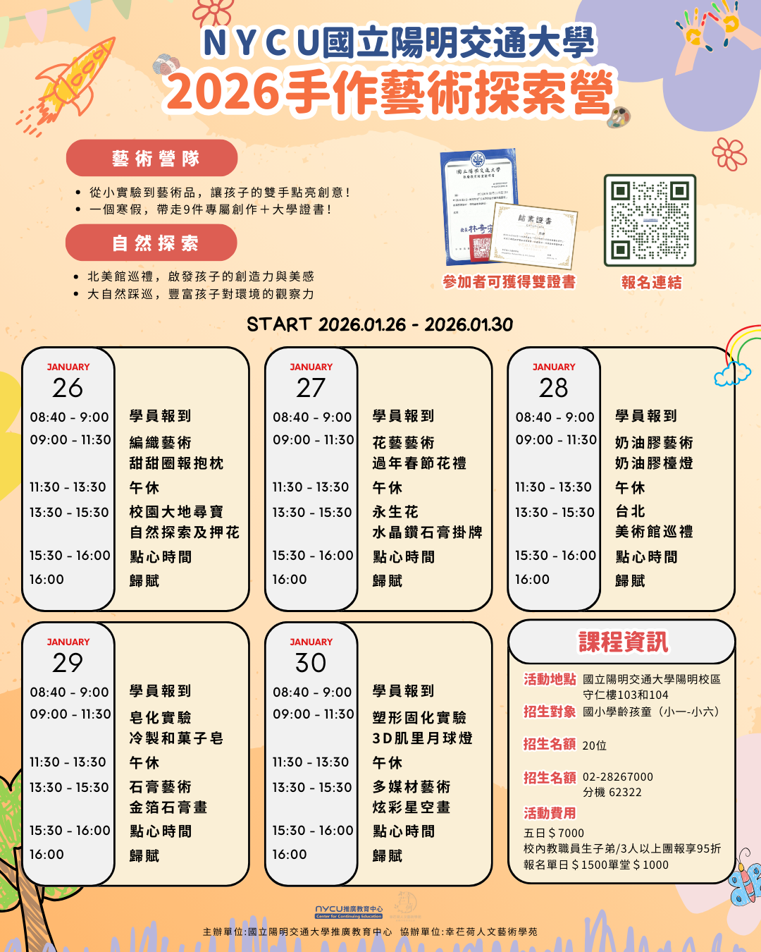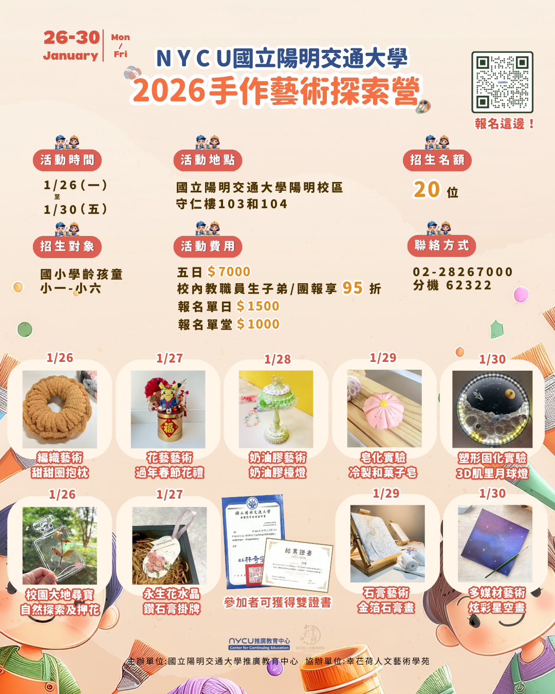 一、 本校推廣教育中心將於115年寒假辦理「2026手作藝術探索營」5日兒童課程,引導孩童探索手作藝術創作的樂趣。