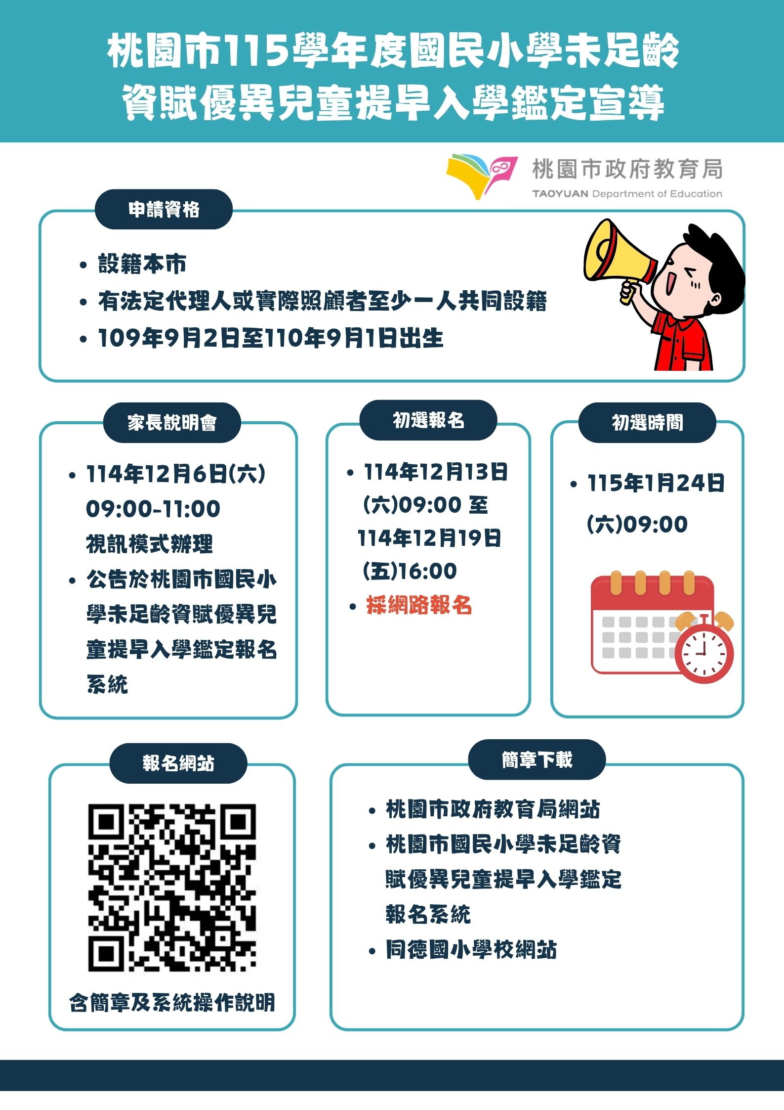 (二) 鑑定說明會:為協助家長了解本市國民小學未足齡資賦優異兒童提早入學鑑定相關事宜,訂於114年12月6日(星期六)上午9時至11時辦理線上鑑定說明會,會議連結另公告於報名系統(網址:https://earlygifted.tyc.edu.tw)。