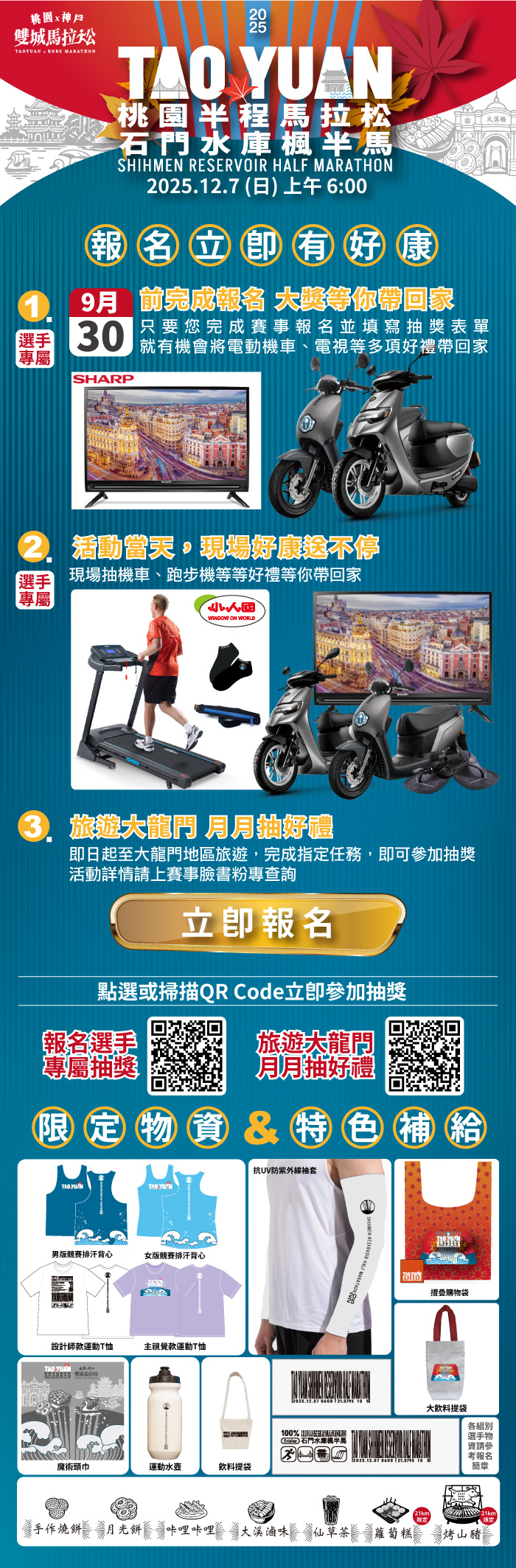 | 三、 | 為宣傳本次活動,請貴機關(學校)協助將相關訊息刊登於轄管官網、電子螢幕(如LED、公車候車亭跑馬燈等)、資訊可變號誌(CMS)或APP資訊平台等各管消息公告管道,其宣傳資訊建議如下:「2025桃園半程馬拉松 石門水庫楓半馬開放報名中,活動詳情請至伊貝特報名網站查詢」。 |
